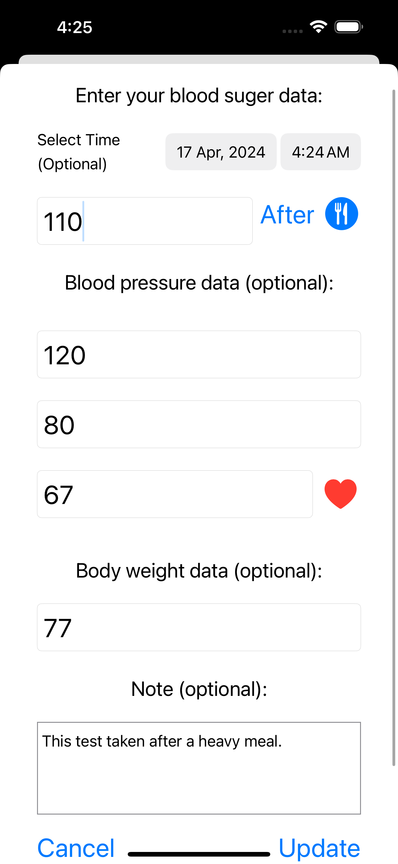 Monitor and track your blood sugar easily. Simple and convenient way to track your glucose levels throughout the day. You can store other relevant info too.